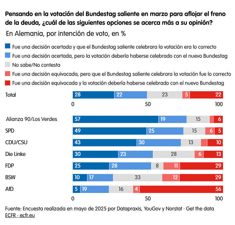 En este sentido, las encuestas son contradictorias. En un momento en el que los presupuestos públicos están sometidos a tensiones, el significativo apetito público por aumentar el gasto en defensa nacional (incluso a expensas de tabúes fiscales) es aún más digno de mención. Por ejemplo, en una pregunta puntual formulada solo en Alemania, el 50 % de los encuestados está de acuerdo en que la votación de última hora del anterior Bundestag para relajar el oneroso freno a la deuda del país fue acertada. Solo el 27 % considera que esta medida, que libera del freno a los gastos de defensa superiores al 1 % del PIB, fue una decisión equivocada.
