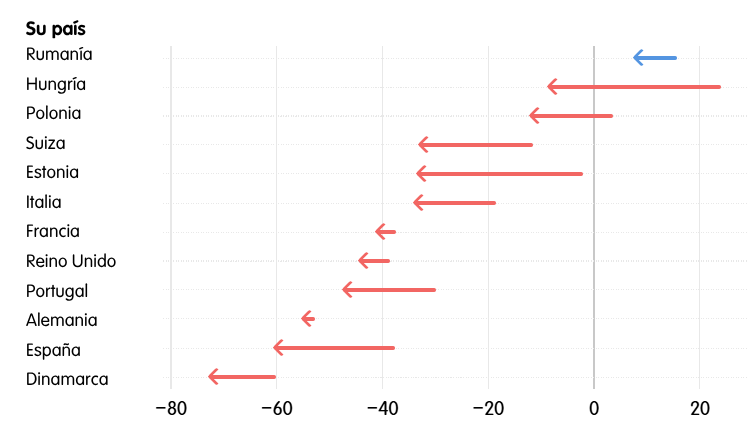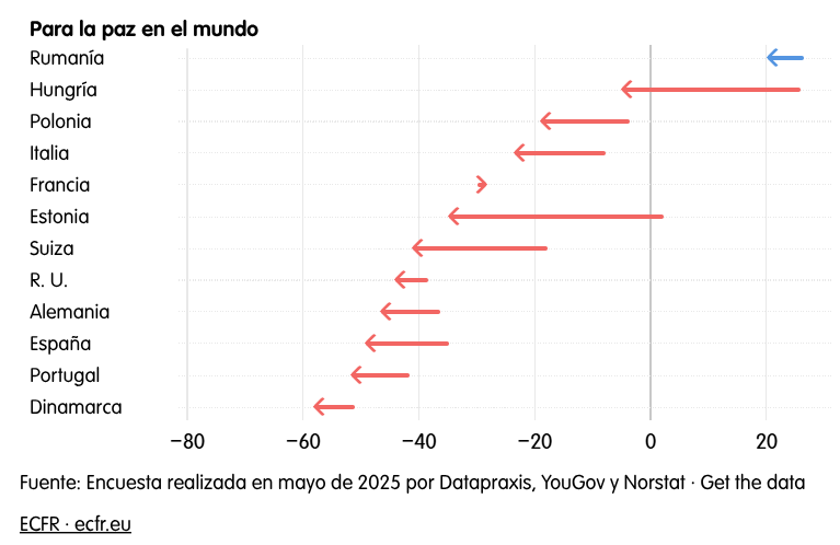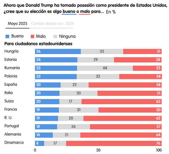 En general, los europeos no se hacen ilusiones sobre Trump. La opinión predominante en los países encuestados (excepto en Hungría y Rumanía) es que su elección es mala para los ciudadanos estadounidenses, para sus propios países y para la paz en el mundo. La mayoría absoluta en la mitad de los países (Dinamarca, Alemania, Portugal, España, Suiza y el Reino Unido) tiene una opinión negativa de Trump en los tres aspectos. Solo el 12% de los británicos cree que la elección de Trump es buena para su país.