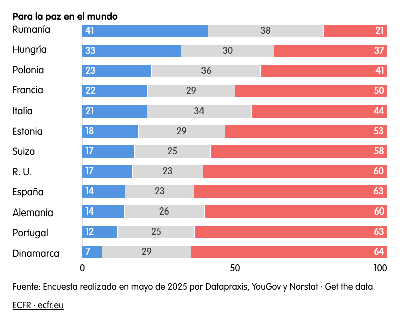 - Muchos europeos apoyan el aumento del gasto militar, el servicio militar obligatorio, la disuasión nuclear independiente y la defensa de Ucrania incluso aun cuando Estados Unidos la abandone.