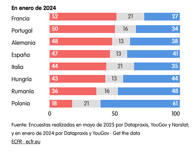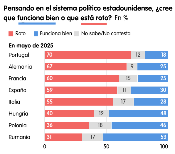 La percepción del sistema político estadounidense también se ha resentido. La mayoría absoluta en Francia, Alemania, Italia, Portugal y España cree que está roto. En enero de 2024, la última vez que el ECFR realizó una encuesta sobre esta cuestión, esto solo ocurría en Francia y Portugal. Mientras tanto, Hungría y Rumanía son los únicos países encuestados en los que la opinión sobre Estados Unidos ha mejorado.