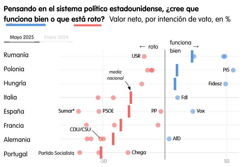 Pero la diferencia es más visible en la yuxtaposición de los resultados de 2024 y 2025. Por ejemplo, los votantes de todos los principales partidos polacos tenían una opinión predominantemente positiva sobre el sistema político estadounidense en enero de 2024, pero ahora solo la derecha trumpiana la tiene, mientras que los partidarios de los partidos mayoritarios se han vuelto mucho más escépticos sobre Estados Unidos. Mientras tanto, en Alemania, los votantes que apoyan a los democristianos de centro-derecha (CDU) y a la Unión Social Cristiana (CSU), y a los socialdemócratas de centro-izquierda (SPD) solían ver el sistema político estadounidense de forma ampliamente positiva, mientras que sus compatriotas votantes de AfD lo consideraban roto. Ahora han cambiado de bando.