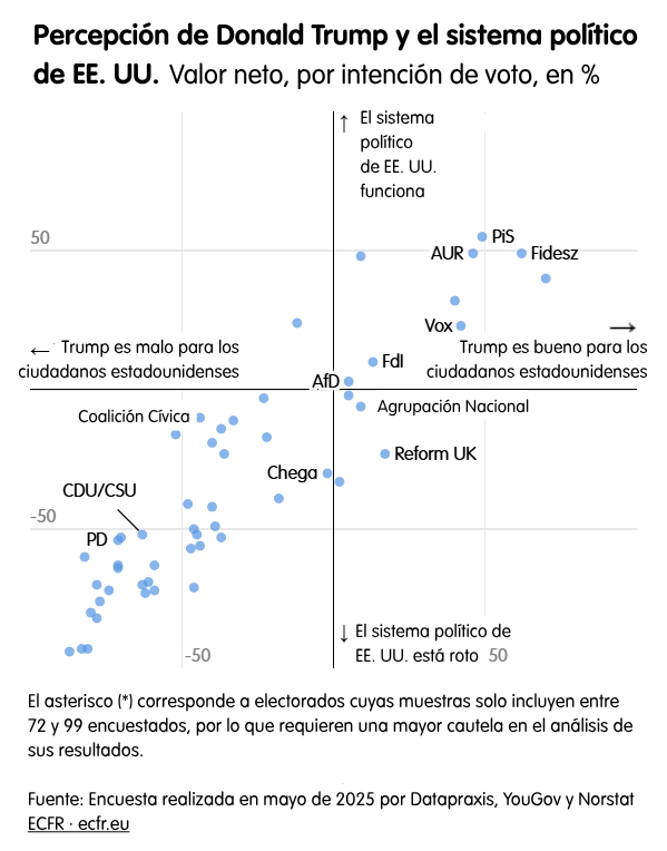Esto también se confirma en el nuevo sondeo del ECFR. Como en los días de la guerra fría, los franceses y los italianos son los revisionistas: al igual que los «eurocomunistas» de los partidos comunistas franceses e italianos en algunos momentos buscaron una mayor distancia de Moscú, la capital de la revolución, RN y FdI hoy son más fríos hacia el Washington de Trump que algunos de sus homólogos en otros lugares de Europa. Este patrón se refleja entre sus partidarios. En términos más generales, la admiración por Trump está claramente correlacionada con opiniones positivas sobre el sistema político estadounidense, y los partidarios de la mayoría de los partidos europeos de extrema derecha son positivos respecto a ambos. Especialmente en un momento en el que ese sistema está experimentando una transformación tan drástica, eso parece sugerir admiración no solo por el presidente, sino por todo su proyecto.